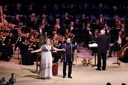 Последние лет двадцать выдающийся хоровой и симфонический дирижер Полянский всемерно продвигает оперу. Так, как он ее видит: с максимальным уважением к авторскому тексту и не допуская волюнтаристских фокусов современной режиссуры. За эти годы им исполнено три десятка театральных опусов – нередко не в строгом концертном варианте, а со значительными элементами театрализации. Солисты выходят в этих semi-спектаклях в костюмах, соответствующих эпохе, прописанной в либретто, на экране демонстрируется видеоряд, также сообразный сюжету – он в известной степени заменяет театральные декорации. Некоторые элементы реквизита присутствуют на сцене, еще более усиливая театральную атмосферу этих концертов, а артисты лицедействуют – режиссеры ставят им мизансцены, помогают прочертить рисунок ролей, сделать исполнение более убедительным, по-театральному эффектным.