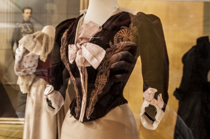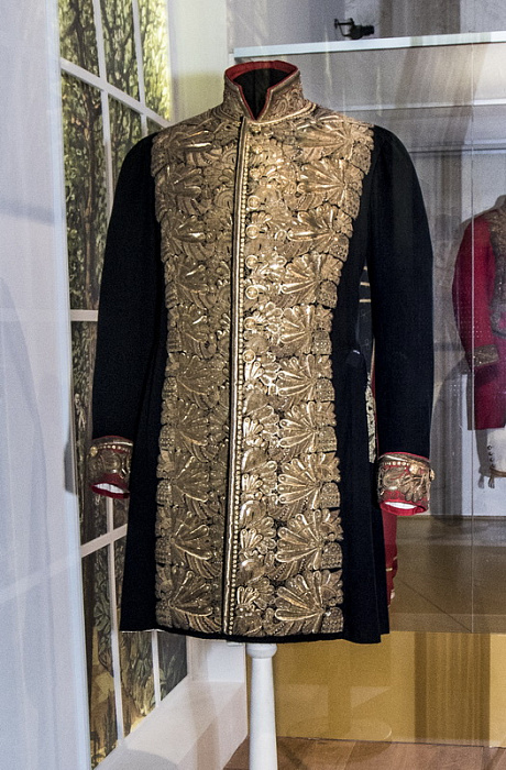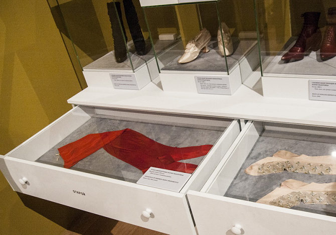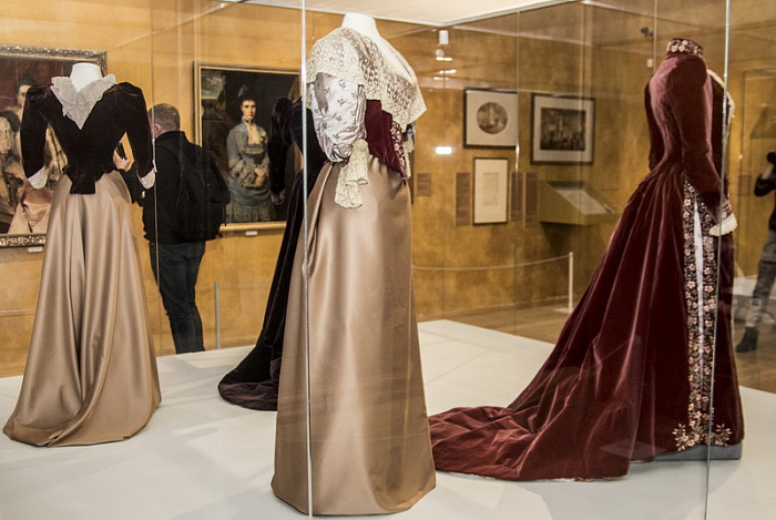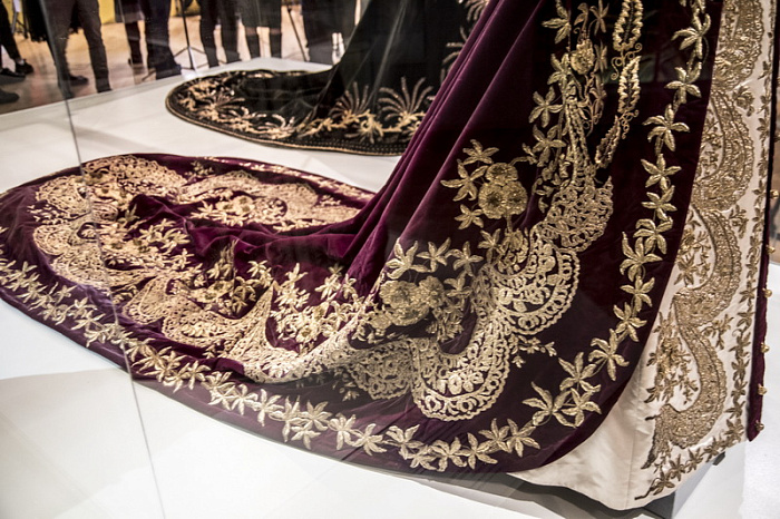 На выставке ведут от мундиров и дамских костюмов, в основном визитных, к балам и маскарадам, завершая маршрут свадьбой Николая II. Зритель оказывается, с одной стороны, в круге многочисленных придворных, от камердинеров до арапов и камер-казаков, а с другой – в круге ателье тех лет: помимо упомянутого дома Чарльза Ворта это петербургские мастерские Ольги Бульбенковой, Мари Нуарель и фирма «И.П. Лидваль». По пути вы попадаете в обозначенные фотообоями личные покои Марии Федоровны с домашними платьями, шляпами, туфлями, носовыми платками и чулками.