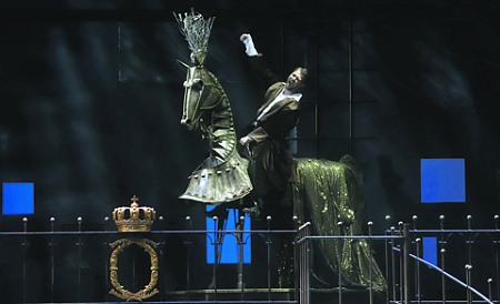 Интересно задуманные вторые смыслы из области психоанализа, впрочем, не всегда ясно прочитываются: двойник Ричарда, кажется, не всегда знает, что делать на сцене, и совершает порой какие-то странные телодвижения – то таскает большие камни, то разводит руками, словно Алан Чумак. Его образ отсылает нас к наделавшему в свое время много шума спектаклю Андрия Жолдака «Евгений Онегин» в Михайловском театре, где тоже есть «маленький человек», названный в программке слугой Онегина. На самом деле он воспринимался зрителями и критиками то как Черномор, то как посланец высших сил, то как alter ego главного героя и даже самого режиссера.