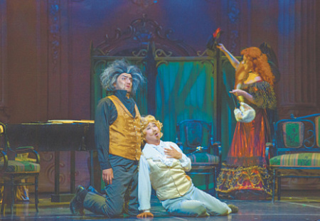 Загримированный не то под Бетховена, не то под Карла Маркса Маэстро-композитор (Антон Морозов), томно-глуповатый Поэт в белоснежном в буклях паричке (Дмитрий Уди) и две истеричные примадонны Элеонора (Елена Тихонова) и Тонина (Светлана Арзуманова) составляют квартет-клоунаду, откалывая номера один нелепее другого: в какой-то момент публика, кажется, уже даже устает смеяться. Сквозь музыкальные рифы оркестр и певцов ведет молодой маэстро Хетаг Тедеев, которому удается собрать пеструю мозаику воедино и дать публике все же услышать и имеющиеся в партитуре Сальери нетривиальные музыкальные идеи.