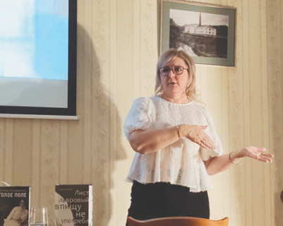 С рассказа о грядущем романе Калинкина перескочила на представление своей дебютной книги «Лист лавровый в пищу не употребляется», назвав ее сагой о старообрядцах. В 2023 году книга попала в длинный список премии «Ясная Поляна». Потом писательница плавно перешла к роману «Голое поле», ключевое событие в котором – это эмиграция, а точнее, бегство в 1920 году остатков Белой армии из Крыма и их «историческое галлиполийское стояние, или сидение – и то и другое обозначение верно, – в открытом поле на спорной территории между Турцией и Грецией в четырех верстах от Галлиполи». Калинкина напомнила слова Ивана Бунина, который сказал о «голом поле», не о самом пятачке, а о том, что происходило в галлиполийском стоянии, что это часть того великого и святого, что явила собой Россия. Писательница гордится «коротким отзывом Леонида Юзефовича», который уже второй раз откликается на ее произведения. Высказывание Юзефовича вынесено на последнюю страницу обложки «Голого поля».
