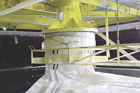 Примыкание расправленного загрузочного рукава вкладыша на установочной траверсе к фланцу загрузочной головки бункера. Фотографии предоставлены автором