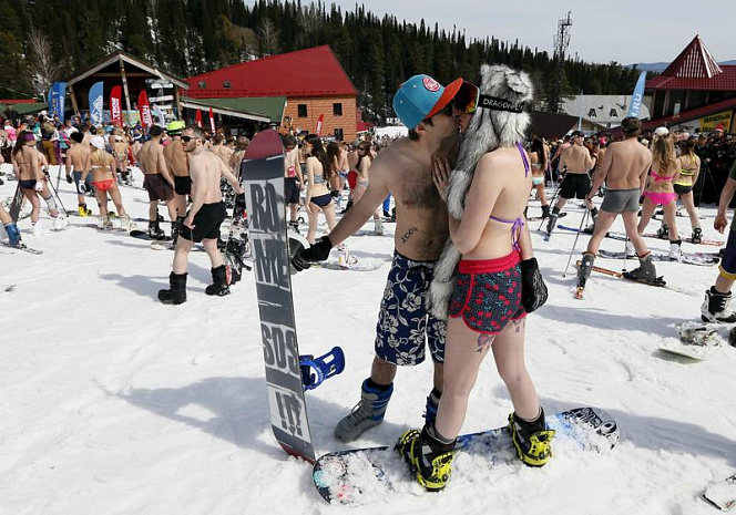 Любители скоростного спуска вышли на склон горы Зеленая (курорт Шерегеш) в плавках и купальниках