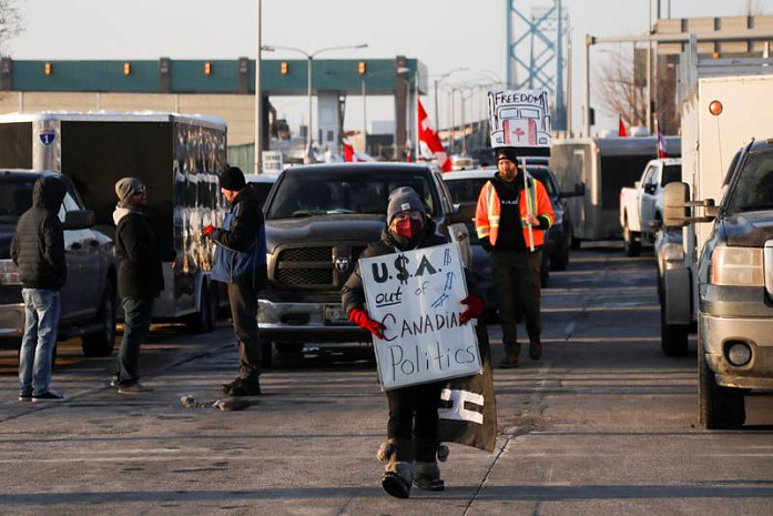 Грузовики перекрыли мост Амбассадор, расположенный между озерами Эри и Гурон. Водители протестуют против приказа о принудительной вакцинации от коронавируса.