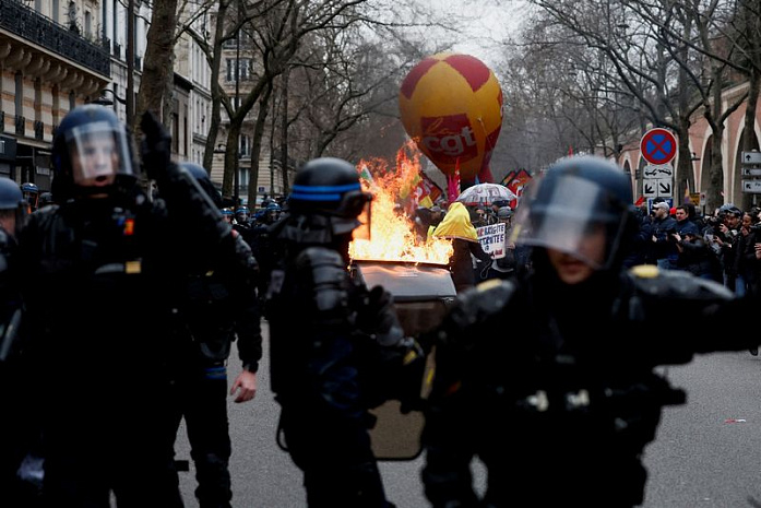 Таким образом граждане Франции выражают свое несогласие с проводимой правительством пенсионной реформой. Полиция вынуждена применять против протестующих спецсредства.