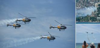 Пилотажная акробатическая эскадрилья ВВС Испании, выступающая на вертолётах Eurocopter EC120, провела воздушно-акробатическое шоу в районе пляжа Ипонема в Рио-де-Жанейро
