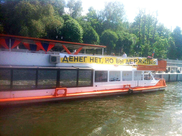Едва завидев разворачивавшиеся баннеры, полицейские тут же затребовали старшего, пояснив, что «акция требовала согласования». Дескать, частный теплоход – это общественное место. Однако после появления транспаранта со ставшими уже знаменитыми «крымскими» цитатами Дмитрия Медведева, вопросы полицейских отпали. «Денег нет, но вы держитесь», – гласила надпись на одной стороне теплохода. «Хорошего настроения!» – на другой.