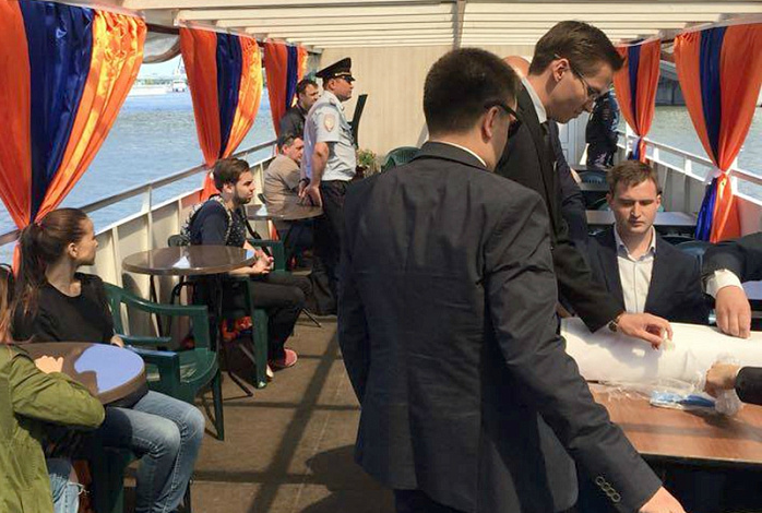 Они проявили себя только тогда, когда кандидаты от «Открытой России» начали разворачивать на теплоходе баннер. По замыслу произойти это должно было напротив Кремля. Однако капитан корабля, сославшись на письмо из Федеральной службы охраны, заявил, что в целях безопасности ему велели изменить маршрут. Описав полукруг, теплоход начал возвращение к причалу.