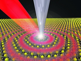 Луч красного лазера, падающий на острие туннельного микроскопа над поверхностью полупроводника, в котором генерируются красные волны квазичастиц.