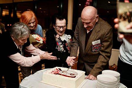 Праздничный торт разрезали старейшие присутствовавшие ветераны - 104-летний Леонид Сошин и 103-летняя Надежда Крючкова. Фото Сергея Сажина