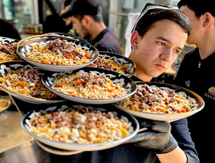 Была у меня зарисовка из Шанхая с иностранцами, замершими от ужаса над мисками с пельмешками, – здесь тоже таким делать нечего. Посетив центр плова и увидев, как в огромном казане, отлитом десятки лет назад и за это время успевшем накормить население средней европейской страны, в литрах масла томится плов, от способа приготовления и вида блюда они, несомненно, упадут в обморок. Но если все же рискнут попробовать ложку (плов едят только ложками) – никаких сомнений: это будет одним из самых ярких кулинарных впечатлений в их скучной диетической жизни.