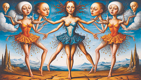 Картинки, сгенерированные ИИ. В каком стиле или жанре ты ни проси уважаемый ИИ сгенерировать картинку, все равно выходит какой-то Сальвадор Дали. Три головы, одна рука, восемь ног и проч. и проч. Красота!