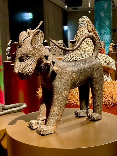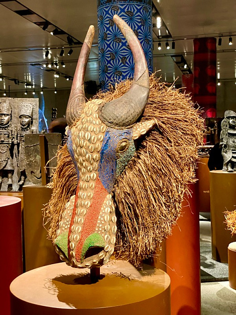 Без этикеток, а лишь с редко мелькающими как будто магическими символами, призывающими прислушаться к аудиогиду, выставка ошеломляет сначала именно массой. Она вся обрушивается на путника в одно мгновение, пульсирует цветом, вибрирует формами, звучит многоголосицей – как и сама Африка, состоящая из сотен народов и языков.