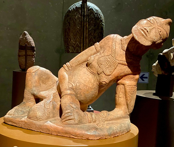 Постепенно взгляд начинает выхватывать то одну экзотическую деталь, то другую. Густо загримированное белилами подмигивающее лицо с черными губами. Вытянутую двенадцатиглазую маску, способную видеть во всех направлениях пространства и времени. Рычащего котенка-леопарда и распластавшегося крокодила. Двух танцующих прародителей, взметнувших ввысь руки в молитве о дожде. Двуглавую собаку, ощетинившуюся гвоздями-иглами. Боевой щит, испещренный узорами-шрамами. «Африканских мадонн», спелые женские статуэтки, символизирующие плодородие и деторождение. Мужские статуэтки правителей, порой не смущающихся демонстрировать свой авторитет.