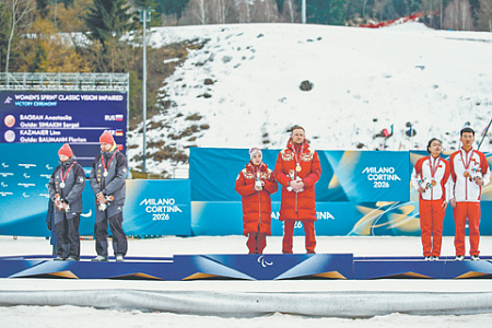 В Милане и Кортина-д’Ампеццо 6–15 марта проходили зимние Паралимпийские игры. В шести видах спорта было разыграно 79 комплектов медалей, РФ представляли шестеро атлетов: горнолыжники Алексей Бугаев и Варвара Ворончихина, лыжники Иван Голубков и Анастасия Багиян, парасноубордисты Дмитрий Фадеев и Филипп Шеббо Монзер. Причем впервые за несколько лет они смогли участвовать в соревнованиях с флагом, гимном и другими национальными атрибутами РФ. Дело в том, что в конце 2025 года в рамках Генассамблеи в Сеуле члены Международного паралимпийского комитета (IPC) проголосовали против полной приостановки и против продления частичной приостановки членства Паралимпийского комитета России. Некоторые иностранные спортсмены выражали недовольство появлением триколора на соревнованиях. Например, в ходе награждения победителей спринтерской гонки среди атлетов с нарушениями зрения (в соревновании победила Анастасия Багиян и ее ведущий Сергей Синякин) представители Германии, в отличие от китайских спортсменов, отказались от совместного фото с россиянами и не стали снимать шапки во время исполнения гимна РФ (на фото). К моменту подписания номера в неофициальном медальном зачете лидером Паралимпиады был Китай, на втором месте – США, на третьем – Россия.
