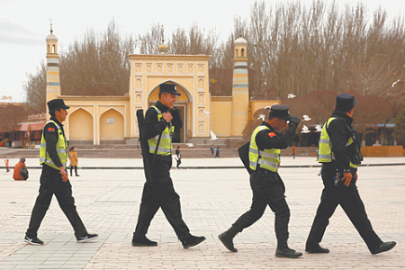 Китайские полицейские круглосуточно патрулируют улицы главного города Синьцзяна Урумчи. Фото Reuters