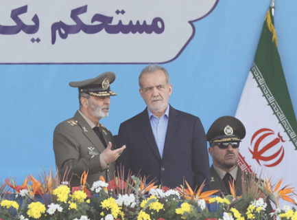 Главнокомандующий иранской армией генерал-лейтенант Абдулрахим Мусави заявил 7 октября, что его страна готова дать Израилю «более сильный и разрушительный ответ», чем раньше. Справа – президент Ирана Масуд Пезешкиан. Фото Reuters